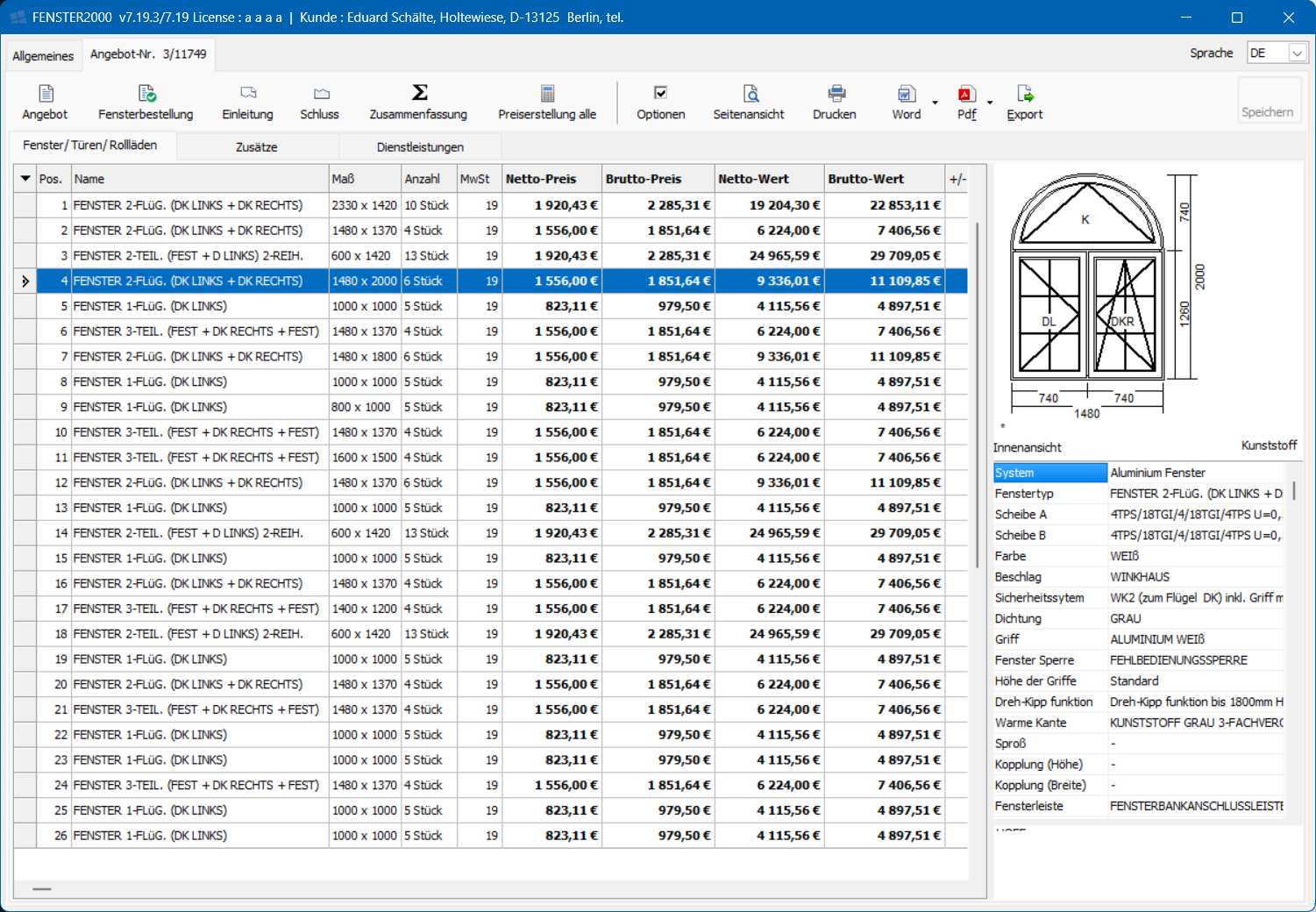 Tutaj możesz dodać poszczególne pozycje do oferty – okna, drzwi, rolety i inne akcesoria. Utworzony dokument można następnie wydrukować, wyeksportować do Worda lub PDF i wysłać do klienta.